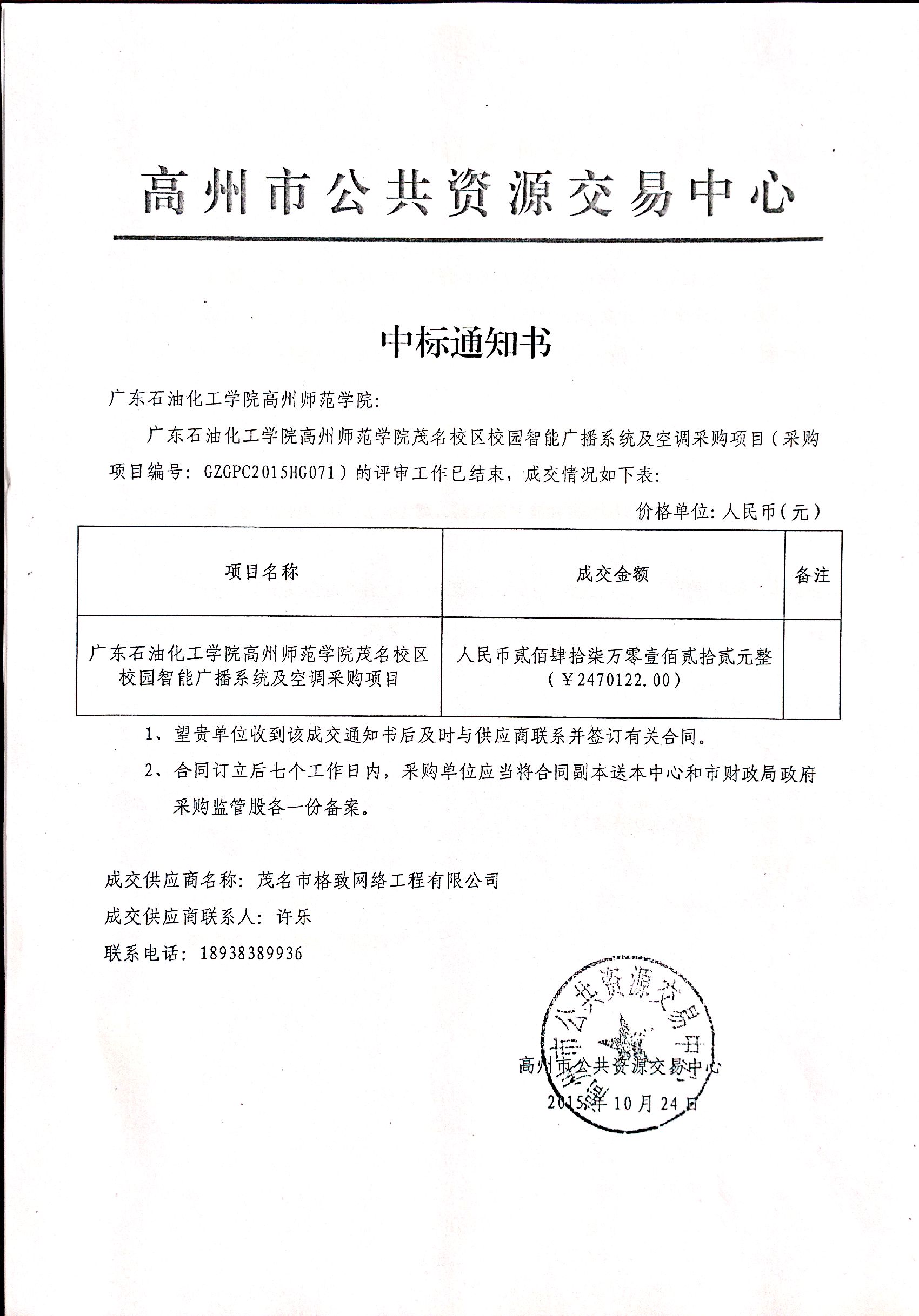 广东石油化工学院高州师范学院茂名校区校园智能广播系统及空调采购项目中标公告