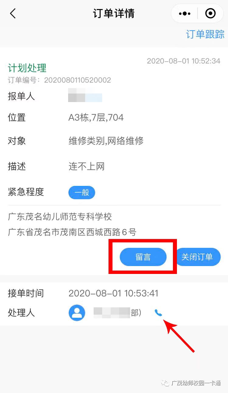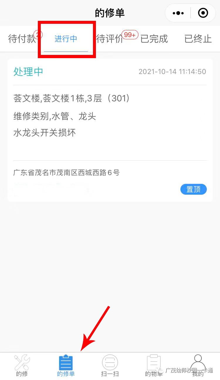①如对订单有疑问或查看维修进度等,可在公众号进入【校园报修】→【的修单】→【进行中】,入所发的维修单界面便可查看订单详情。同时,还可对报修项目进行评价哦